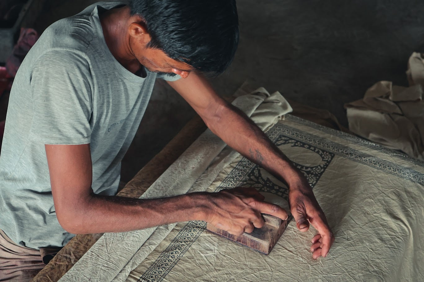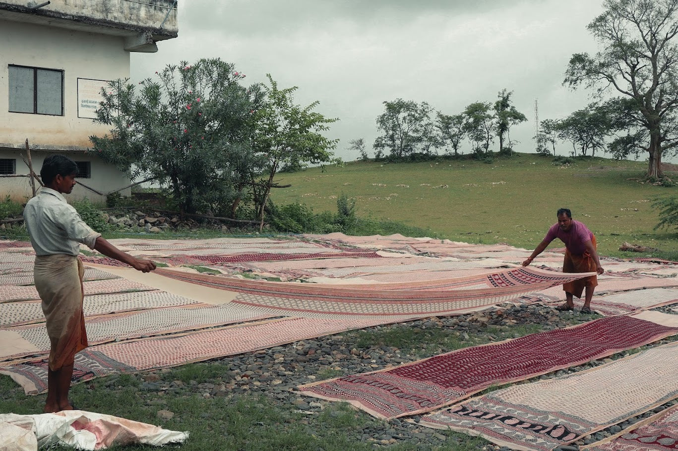 Dyeing and Finishing: Lastly, the printed fabric is dried and submerged in a solution of water and alum, which fixes the dye and enhances the vibrancy of the hues. Then the fabric is sun-dried to develop its rich tones and washed. Ancient artisans used to wash the fabric in the Bagh River, whose mineral-rich waters rendered the fabric its characteristic softness and lustre, hence the name Bagh.